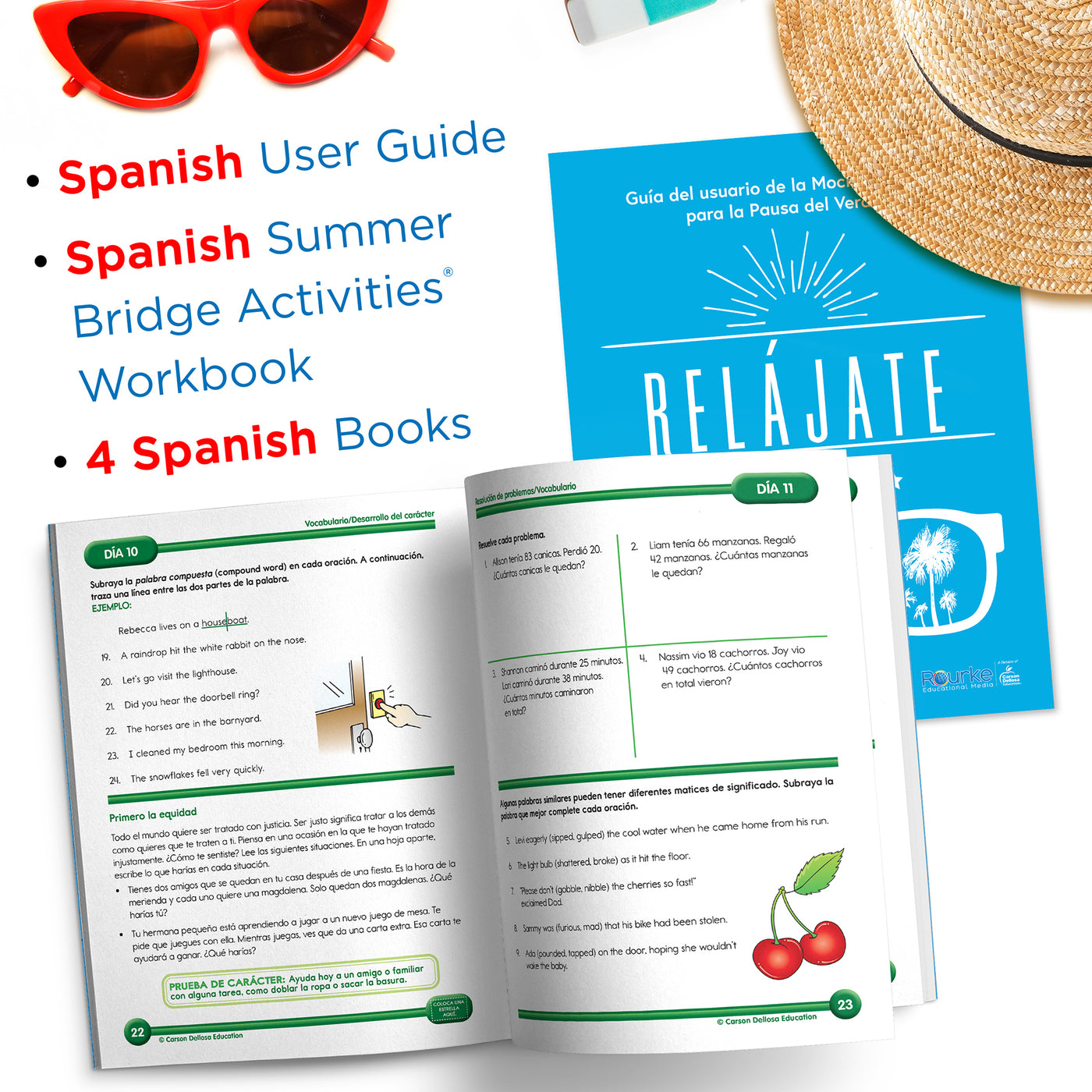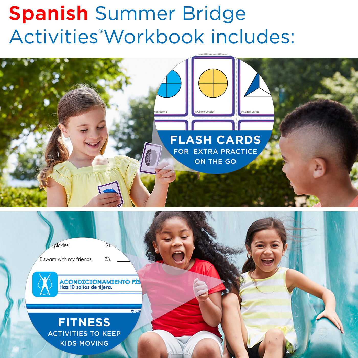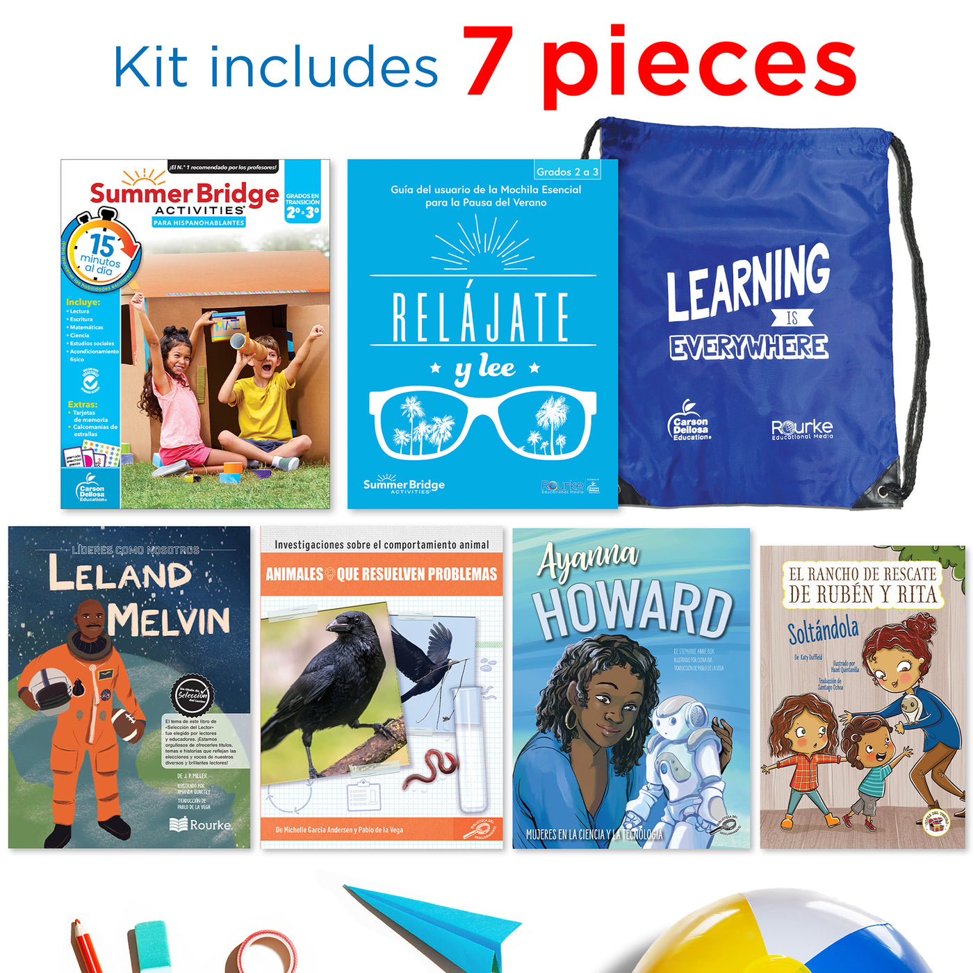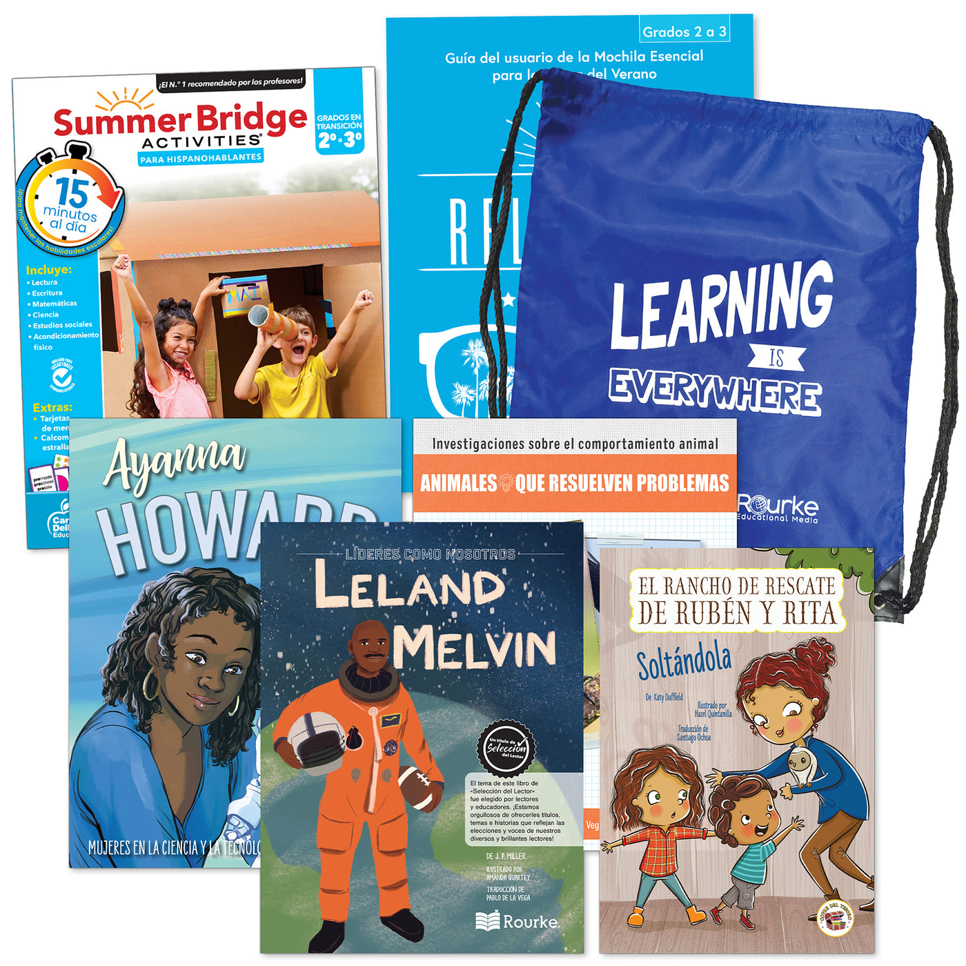 Build a bridge of learning opportunities for your soon-to-be 3rd grader—from school to home and back again in just 15 minutes a day—with engaging children's books, manipulatives, and learning adventures—all in one bundle! Spanish workbooks and children's books are a great way for to reinforce second grade skills and prep your child for third grade through fun, active learning adventures. Students dive into the magic of reading while developing their reading comprehension skills with a variety of nonfiction and fiction children's books. The 160-page 2nd grade workbook to 3rd grade workbook features math, science, social studies, reading, and handwriting practice, and includes flash cards, stickers, fitness activities, and more! Spanish instructions and lessons in the Spanish workbook for kids help Spanish-speakers to work alongside their child, with English translations of vocabulary in parentheses where applicable for activities that help students learn English concepts. Activities pertaining to learning English are written in English with Spanish instruction. A Spanish user guide is also included for added engagement. Each Spanish language learning resource is stored securely in the durable drawstring bag so your child can practice skills on-the-go all summer long.