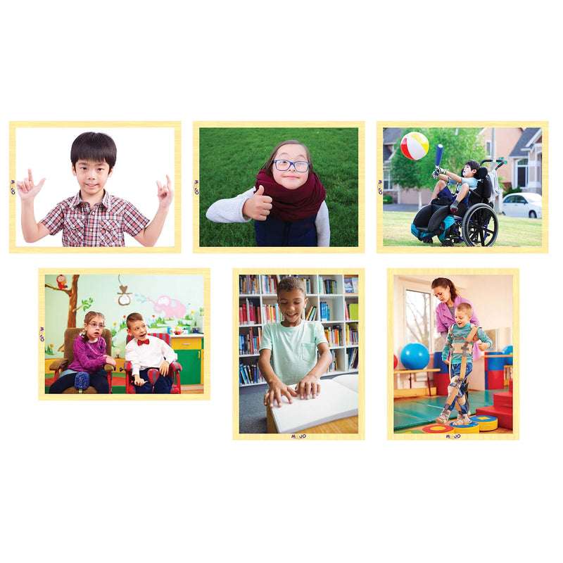 MPN: 006236UPC: 892873001952All children live with challenges, regardless of their abilities or physical limitations. This puzzle set celebrates our uniqueness and how some children overcome challenges in daily life. This set of six wooden puzzles of real children walking, playing, and socializing are helpful for any classroom promoting inclusio...